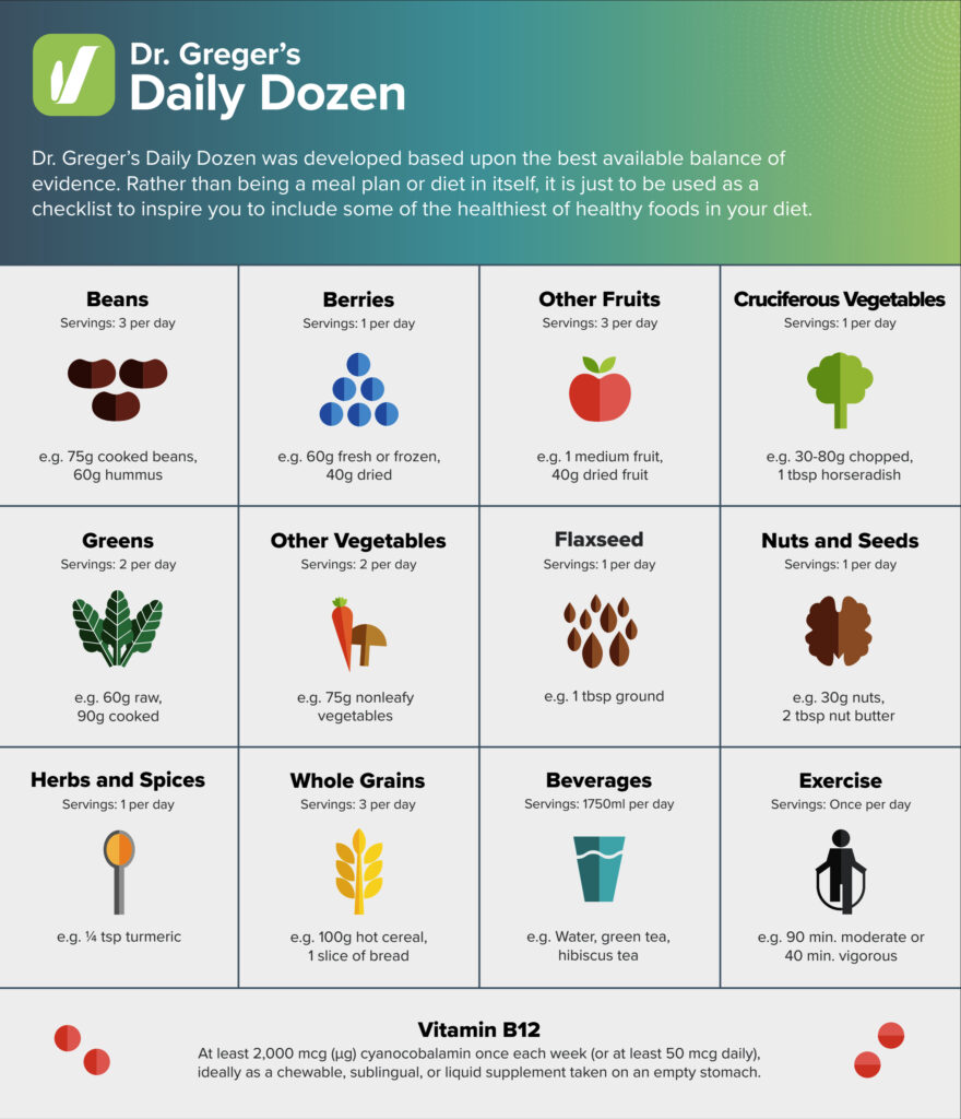 So, what’s the “daily dozen”? This page explains it much better than I could: https://nutritionfacts.org/daily-dozen/.